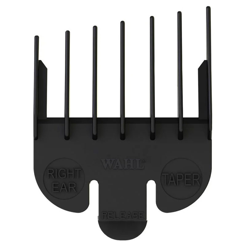 The Wahl Right Ear Tapered Clipper Comb is an essential attachment designed for barbers and hairstylists to create flawless taper cuts around the right ear. This specialized black comb attaches securely to all Wahl taper clippers, increasing the cutting length and allowing for a smooth, even taper along the right earline. With its durable design and perfect fit, it provides greater control and accuracy, helping you deliver professional results every time.